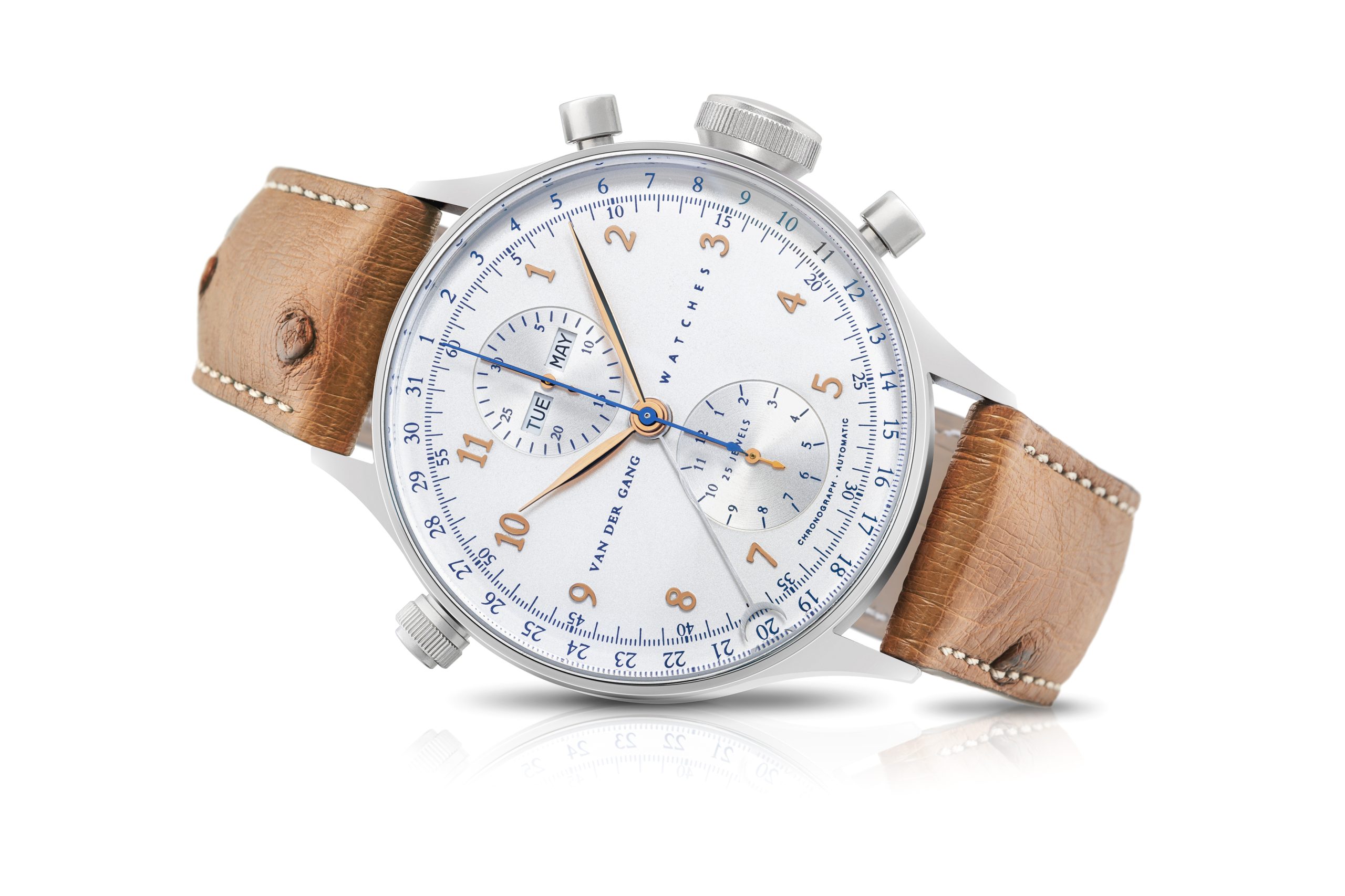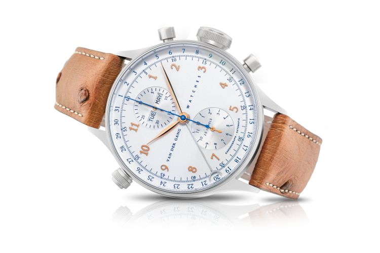De witverzilverde wijzerplaat met gouden appliques en wijzers maakt dit horloge uniek. Het bijna speelse halve maantje aan het uiteinde van de wijzer van de datumaanduiding is een detail dat een horloge een Van der Gang maakt. Dit geldt ook voor de wijzers. De uren- en minutenwijzers zijn goud, terwijl de chronograafwijzer blauw is. Oplage 19 stuks.