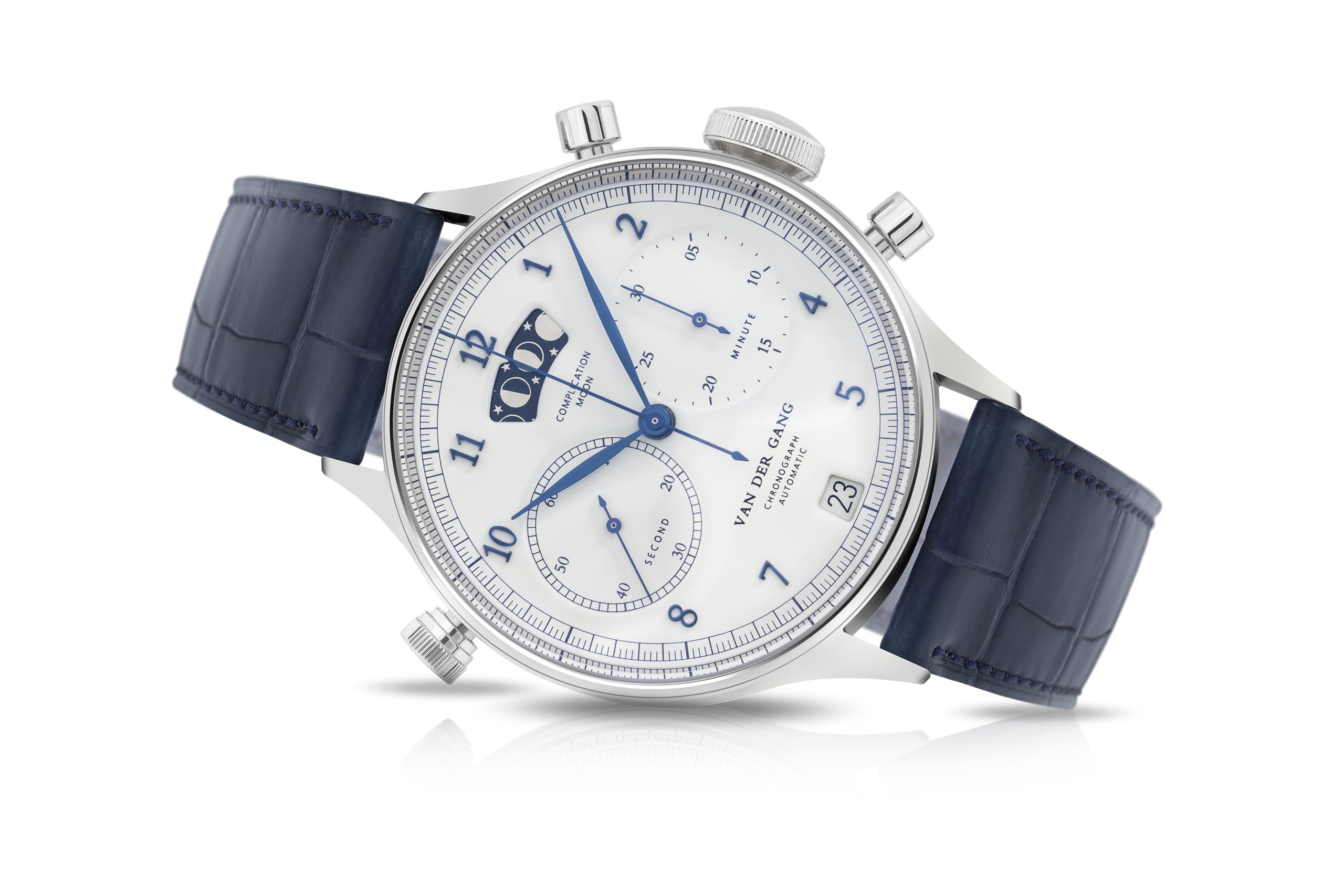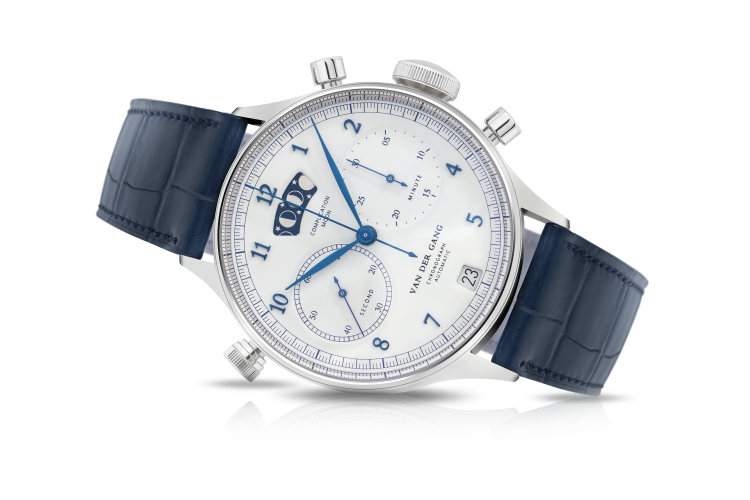 De blauwe applique cijfers maken dit horloge unziek. De wijzerplaat is uitgevoerd in wit emaille, een glad en hoogglanzend materiaal dat in lagen wordt aangebracht en op hoge temperatuur wordt gebakken. De staal geblauwde wijzers geven het model extra cachet. Oplage 4 stuks.