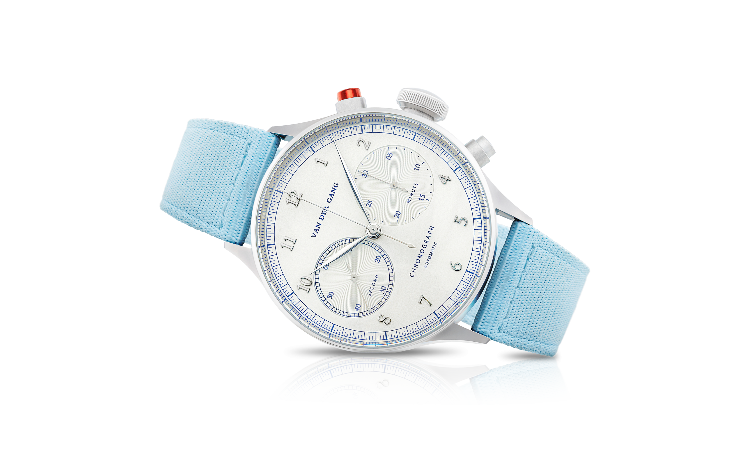 Bij de ontwikkeling van de Chronograafserie is gekozen voor relatief grote seconden- en minutentellers. De helder vormgegeven wijzerplaat is sober en laat de minuterie en kleine seconde zien in de klassieke ‘Eisenbahn’. Typerend voor Van der Gang Watches zijn de robuuste, geharde horlogekast en het ontspiegelde, tweezijdig violet gecoate saffieren glas.