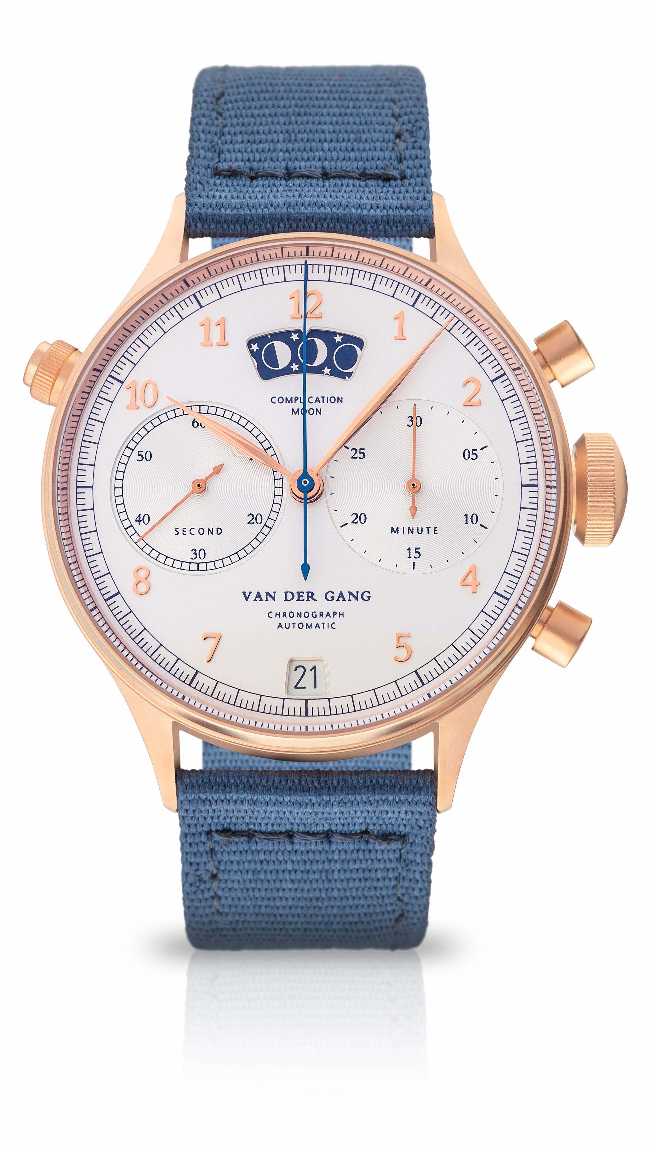 The white silver-plated dial of this series forms a wonderful and distinguished unity with the satinized matte casing. Both the date and the moon complication were developed in-house by Van der Gang Watches. Limited edition of 99.